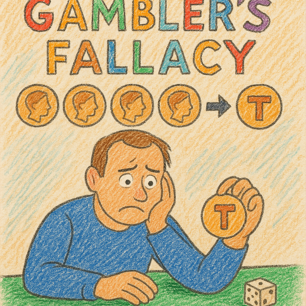 도박사의 오류는 '독립적인 확률 사건이 서로에게 영향을 미친다'고 착각하는 인지 편향을 의미합니다. 동전 던지기에서 앞면이 연속으로 다섯 번 나왔다면, 다음에 던졌을 때는 뒷면이 나올 확률이 더 높을 것이라고 생각하는 것이 그 대표적인 예시입니다. 하지만 동전 던지기의 매 결과는 독립적이므로, 다음에 앞면이 나올 확률과 뒷면이 나올 확률은 여전히 50%로 동일합니다. 이처럼 우리는 과거의 패턴에 사로잡혀 미래를 잘못 예측하는 오류를 범하곤 합니다.